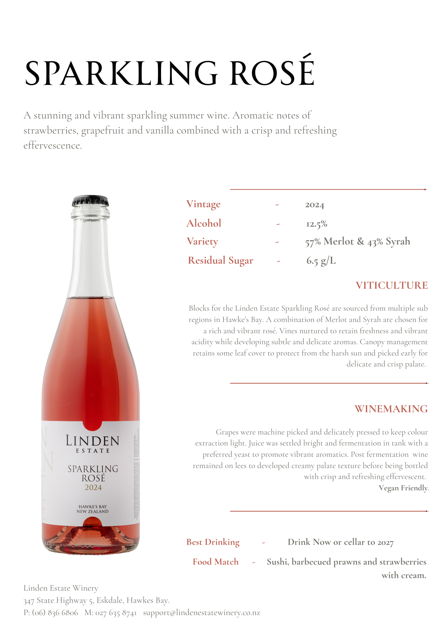 This 2024 Sparkling Rosé has a cranberry colour with a shining hue. On the inviting nose you have bright aromas of raspberries, rose petals, white strawberries and a deft note of cranberry. On the effervescent palate you have upbeat medium-to-large bubbles with an refreshing nature, showcasing those raspberry & strawberries flavours along with a splash of fruit acidity. The wine has retained a hint of natural fruit sweetness and has a appealing, casual personality that signs off with a vivid finish.
